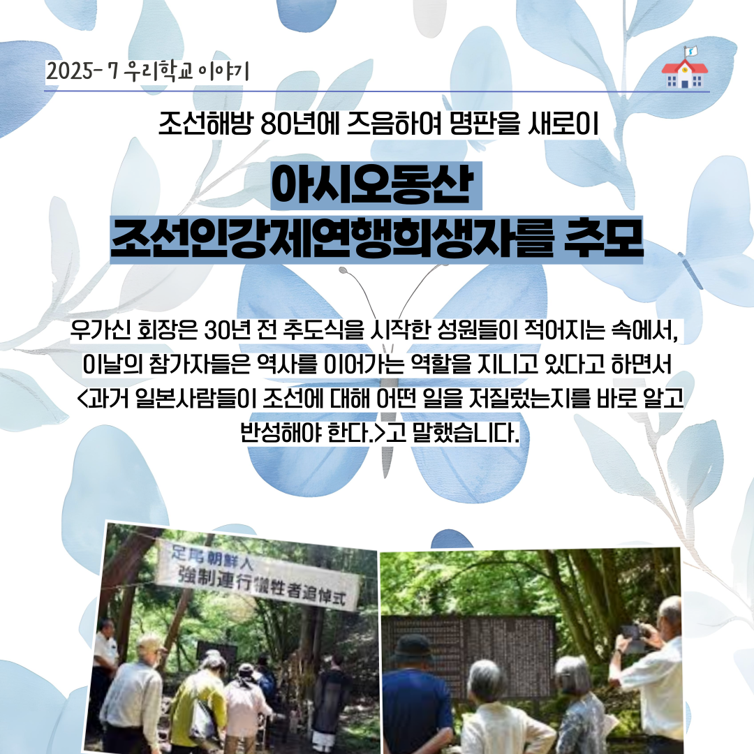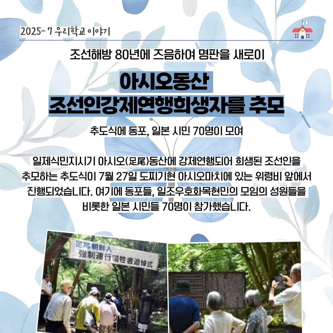 추도식에서는 위령비 옆에 세워진 목제명판을 조선해방 80년에 즈음하여 알루미늄 판으로 교체하였다는 것이 보고되었으며 추도식이 끝난 후 참가자들이 교류를 위한 식사 자리가 있었습니다.