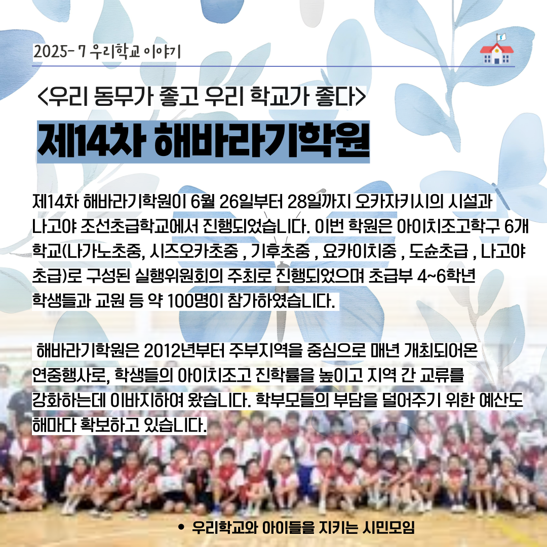제14차 해바라기학원이 6월 26일부터 28일까지 오카자키시의 시설과 나고야 조선초급학교에서 진행되었습니다. 이번 학원은 아이치조고학구 6개 학교(나가노초중, 시즈오카초중 ,기후초중 ,요카이치중 ,도슌초급 ,나고야초급)로 구성된 실행위원회의 주최로 진행되었으며 초급부 4~6학년 학생들과 교원 등 약 100명이 참가하였습니다.