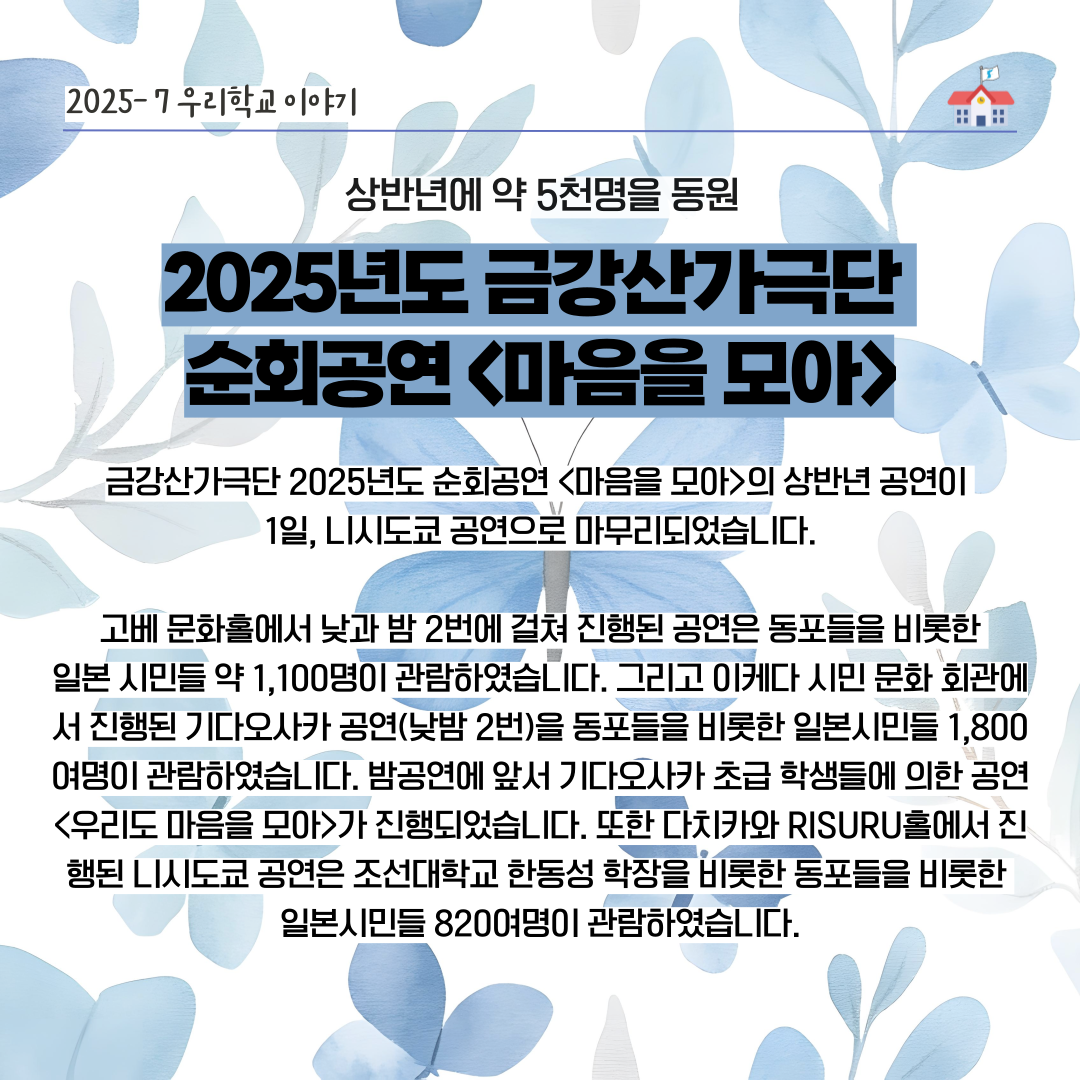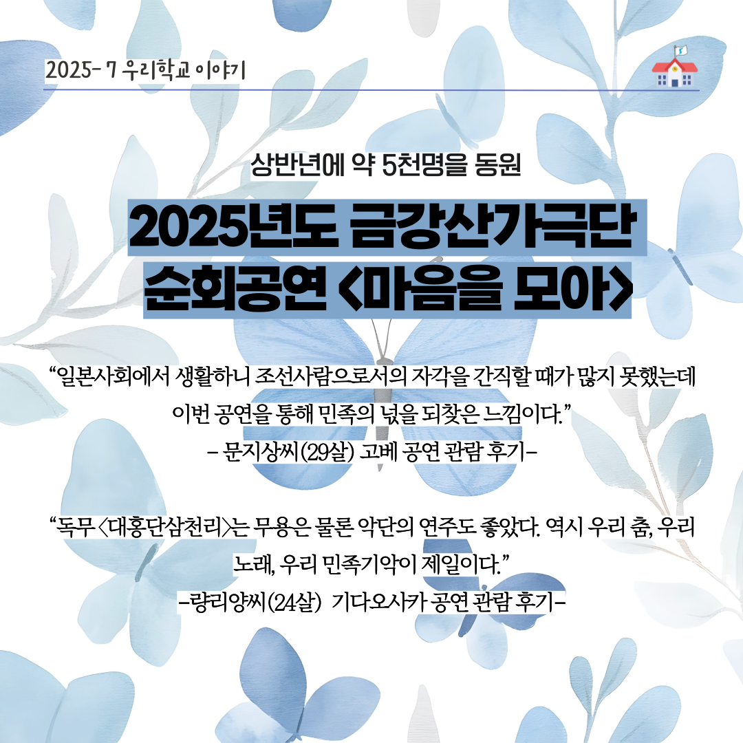 금강산가극단 2025년도 순회공연 <마음을 모아>의 상반년 공연이 1일, 니시도쿄 공연으로 마무리되었습니다. 도쿄(6월 20일)에서 첫선을 보인 순회공연은 상반년에 고베(6월 26일), 기다오사카(6월 28일), 니시도쿄에서 진행되어 약 5천 명의 관객들에게 민족예술의 감흥을 안겨주었습니다. 하반년 공연은 8월 30일의 교토를 시작으로 하여 니이가다, 나가노, 오카야마를 비롯한 13곳에서 진행될 예정입니다.