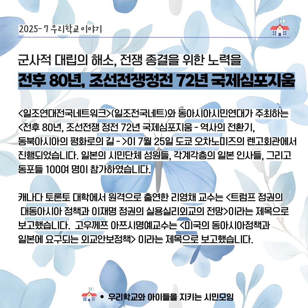 <일조연대전국네트워크>(일조전국네트)와 동아시아시민연대가 주최하는 <전후 80년, 조선전쟁 정전 72년 국제심포지움-역사의 전환기, 동북아시아의 평화로의 길->이 7월 25일 도쿄 오차노미즈의 렌고회관에서 진행되었습니다. 일본의 시민단체 성원들, 각계각층의 일본 인사들, 그리고 동포들 100여 명이 참가하였습니다.